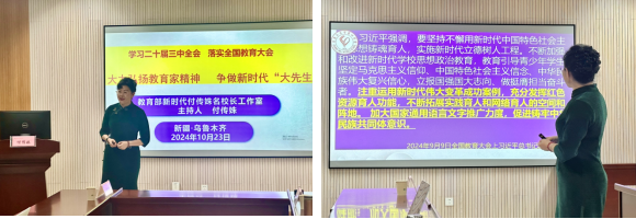 付传姝老师带来了题为《大力弘扬教育家精神,争做新时代大先生》的精彩演讲。付老师从教育家的视角出发,提出在新时代背景下,教育者应秉持“以学生为中心”的教育理念,勇于创新,不断重构传统教学模式。付老师对国家的最新教育政策进行深入的解读,与学生共同探究六条教育家精神的内涵,并指出真正的教育家精神在于不断反思、勇于实践,始终将学生的成长需求放在首位。她对“树人”的教学主张做出新的解读,倡导要像培育大树一样办教育,像种树一样育学生,提出了培养“大气”之人、培养“大智”之师、培养“大趣”之生三大办学理念,以及以“致真、致慧、致远”为核心的“三致”校园文化。最后,她热情介绍了自己所担任校长的乌鲁木齐第四中学的办学特色,展示以学生为中心开展的一系列趣味校园活动与创意校园布置,提出学校秉持充分给予学生学习的自由与快乐的理念,旨在培养会学、会玩、自信出彩的人。