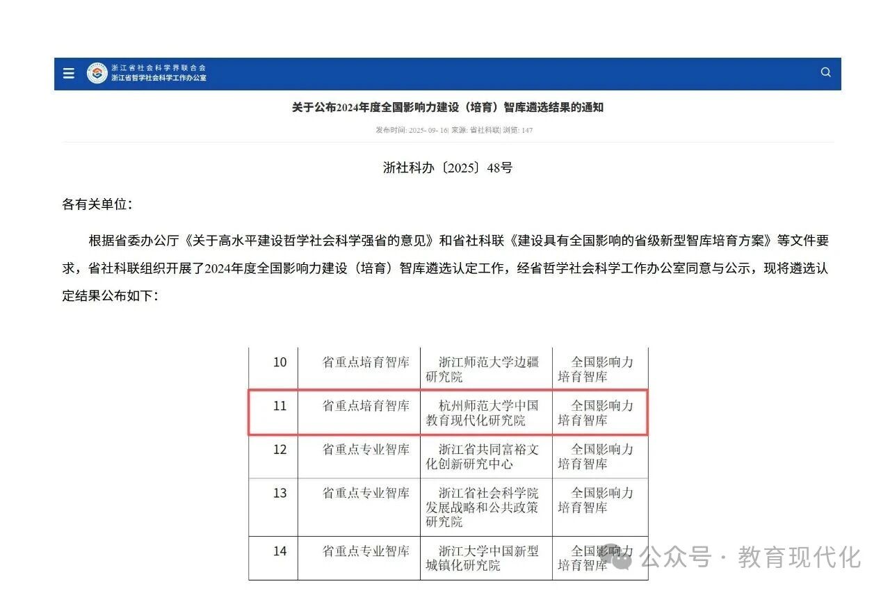 2025年9月16日,浙江省哲学社会科学工作办公室公布了2024年度全国影响力建设(培育)智库遴选认定结果。经智库自评、省社科联审核,省社科联党组研究同意,共认定了1家全国影响力智库、15家全国影响力建设智库、14家全国影响力培育智库。其中,杭州师范大学中国教育现代化研究院入选为全国影响力(培育)智库。