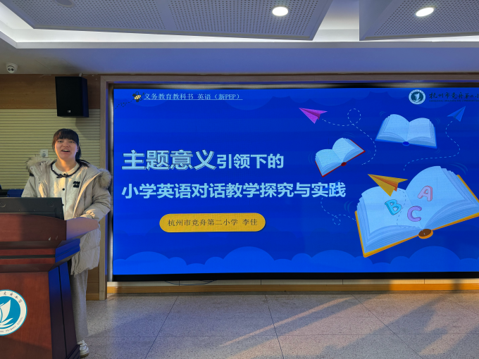 两节课后,吴婕老师与李佳老师分别作了题为《探主题 创语境 设活动——小学英语词汇教学策略的探究》和《主题意义引领下的小学英语对话教学探究与实践》的观点报告。她们从理论出发,结合课例具体环节,阐述了如何在教学中贯彻主题意义,创设真实语境,设计递进活动,从而提升学生的语言运用能力与思维品质。