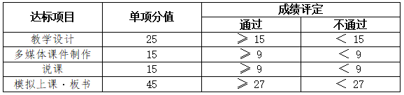 达标考核成绩分通过与不通过两个等级。要求考生各单项成绩均通过,总成绩方可定为通过,即达标过关;否则成绩定为不通过,即达标不过关。对于达标不过关者,不允许毕业,必须补测过关。