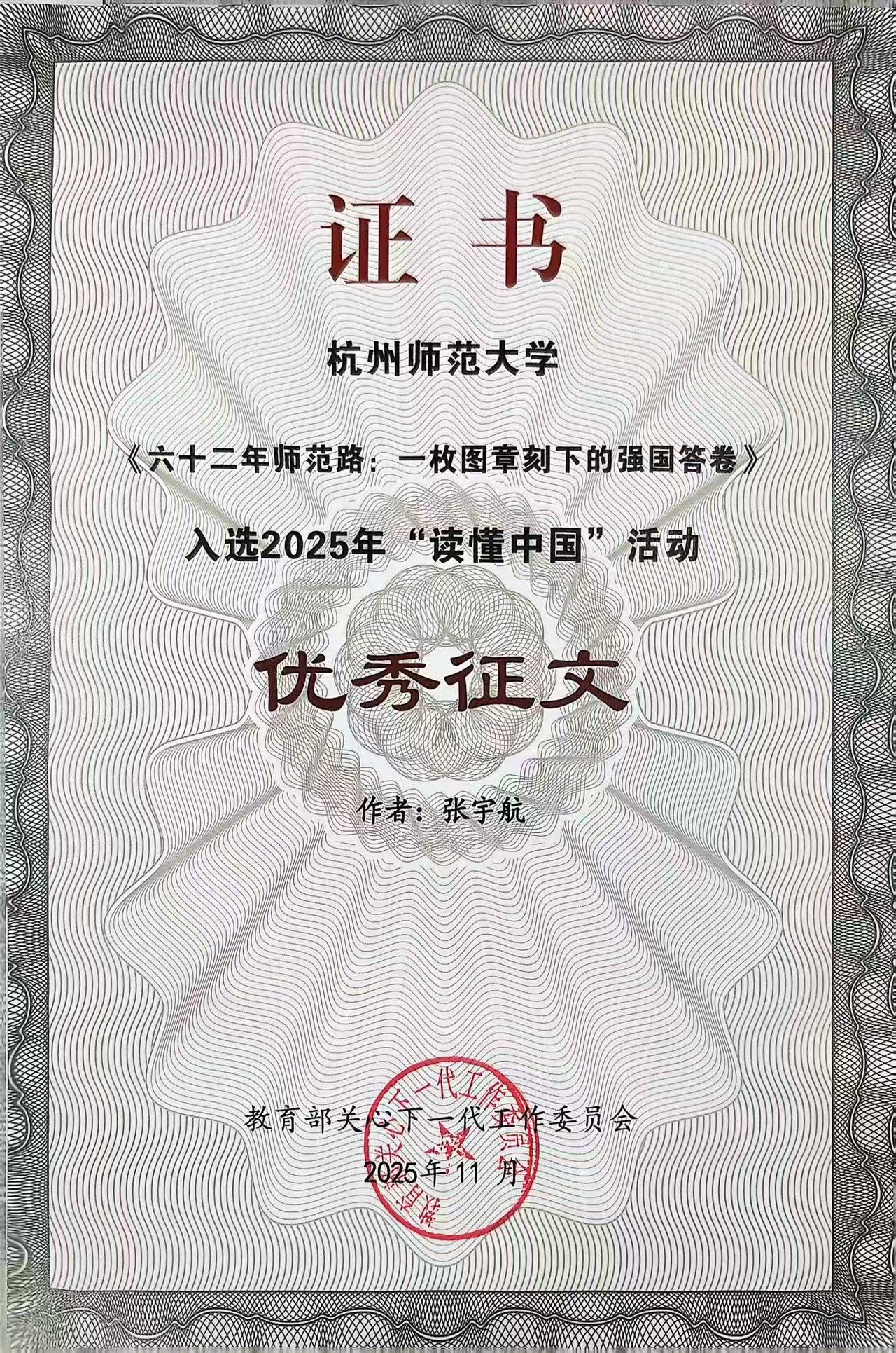 近日,教育部关工委2025年“读懂中国”活动优秀作品评选结果正式公布,由现金网 汪康琳老师指导、特殊教育专业学生张宇航撰写的《六十二年师范路:一枚图章刻下的强国答卷——记浙江省特级教师、杭州师范大学教学督导王家祥》一文成功入选2025年“读懂中国”活动优秀征文。
